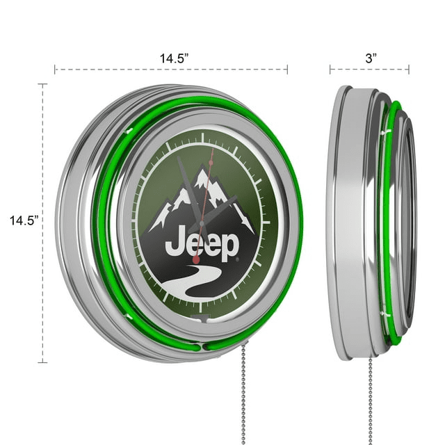This officially licensed neon wall clock is the perfect addition to any game room, garage or man cave. This impressive clock has two neon rings; one is an accent colored neon ring on the exterior and the other is a brilliant white neon ring on the interior of the clock to light up your favorite logo. Other highlights include chrome finished resin housing and a high-grade glass clock face cover. The battery-operated quartz clock mechanism will keep it ticking for a long time, while the neon runs off the included ac adapter. The neon is controlled by the pull chain and the back of the clock includes a wall hanging mount and has two modes � solid state and blinking. The 3 in depth of this clock combined with the radiant shimmer of the neon reflecting off the chrome housing is sure to make this clock pop on any wall!